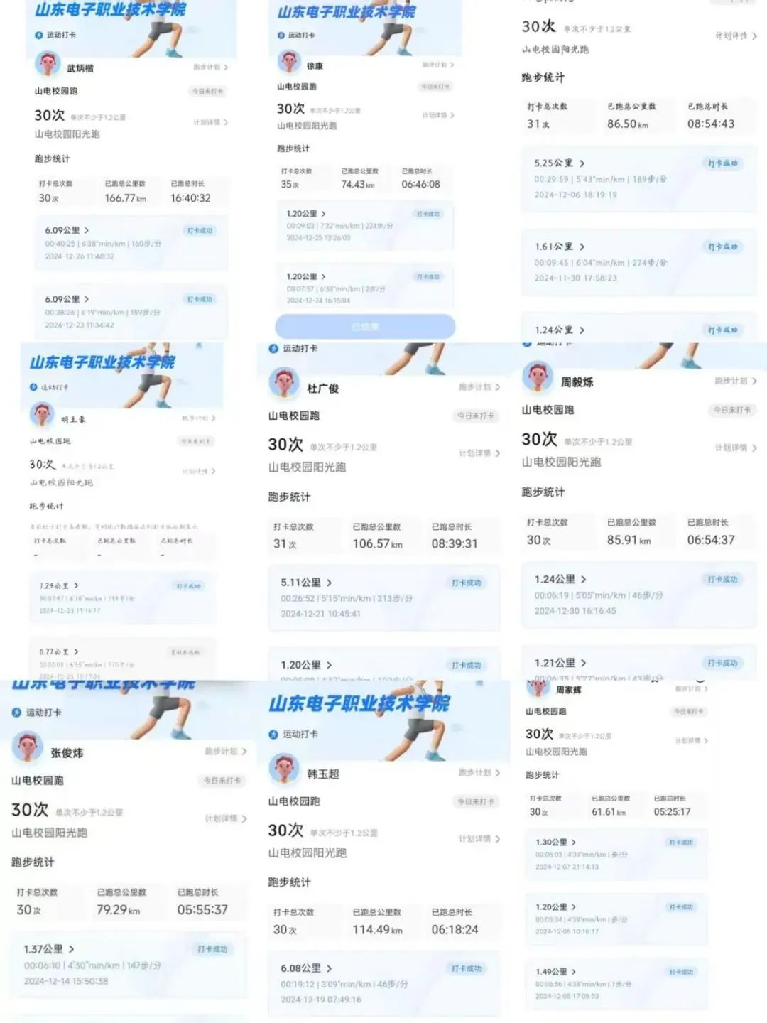 体育运动打卡,绝非流于表面的形式之举,而是莘莘学子对健康生活许下的庄重誓言,是自我砥砺、自我鞭策的精进之道。从晨曦初露,操场上跃动的矫健身姿,到暮色四合,球场上飞扬的潇洒背影,都饱含着对运动的热爱与执着。在此,对以下几位同学提出表扬,你们以钢铁般的意志,在体育打卡的道路上持之以恒,为身边的同学树立了熠熠生辉的榜样!