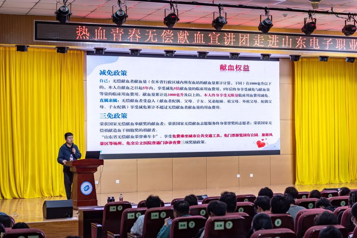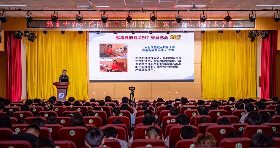 为弘扬奉献精神,普及献血知识,激励青年学子积极参与献血公益,4月21号下午,山东电子职业技术学院开展了献血知识讲座活动,邀请济南市血液中心的张梦超老师担任主讲。我院积极参加本次讲座,号召我院同学积极行动起来,用实际行动诠释爱心与责任。