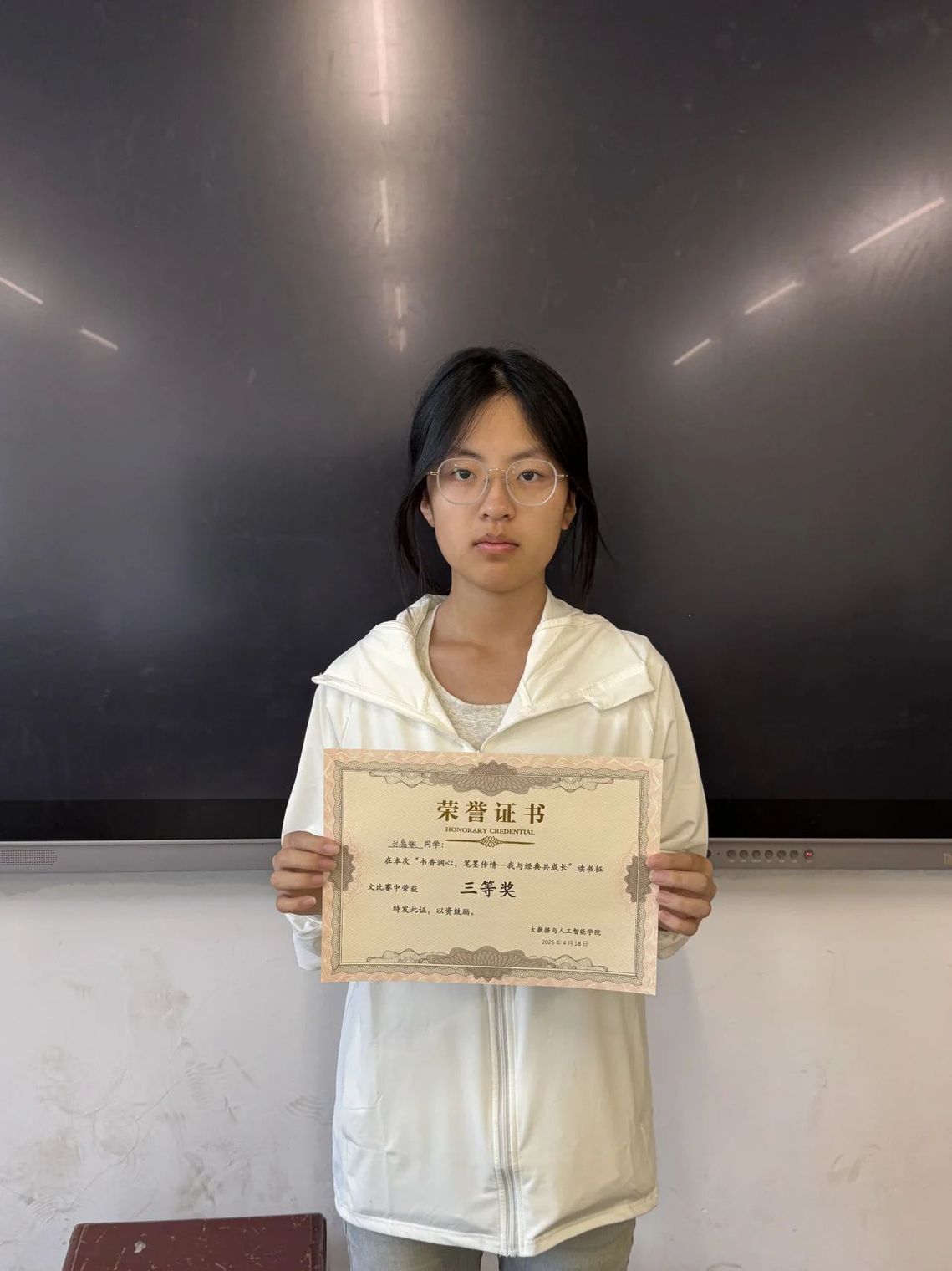 获得三等奖的有 J2400916刘明轩、J2400616刘慧欣、J2400241孙嘉敏、J2400240聂世珍、J2401548韩子祥、J2400739姚浩、J2400310伏圣洁、J2400248解荣荣、J2401416刘林菲、J2400920刘静瑜十位同学,同样表现出色。他们文字功底扎实,感悟独到,一篇篇作品犹如夜空中闪烁的繁星,以各自独特的光芒照亮了经典这片浩瀚的天空,为读者带来了别样的阅读体验。