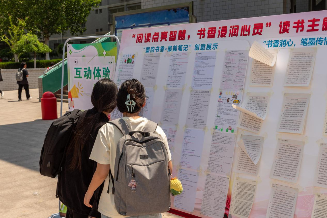 读书主题教育月成果展示区满是书香墨韵。读书征文比赛优秀作品展区,文章情真意切,记录着同学们的阅读感悟与思考,大家在品读中交流心灵。“墨韵书香•最美笔记”创意展示区,一本本笔记似艺术品,同学们用彩笔、创意排版等方式记录知识感悟,相互交流学习经验,立志养成良好习惯。