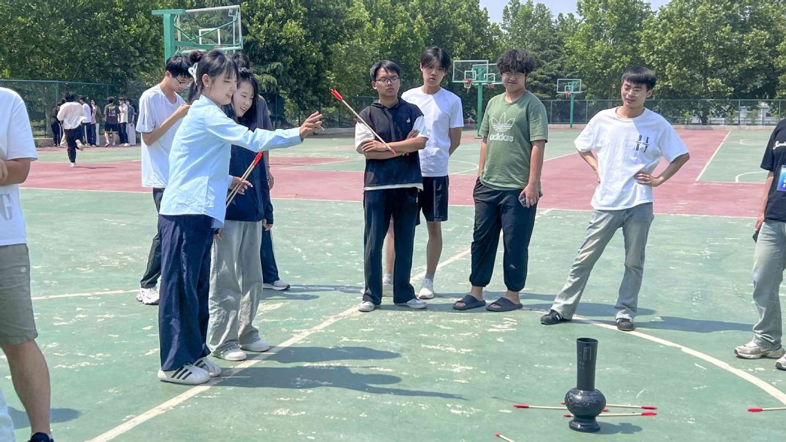 活动现场,四大民俗运动项目轮番上演,热闹非凡。跳绳比赛中,选手们身姿轻盈,手中的绳子飞速旋转,双脚如同装上了弹簧,在地面上快速跳跃,围观群众齐声计数,现场气氛紧张又热烈;丢沙包区域,进攻方灵活投掷,沙包在空中划出一道道弧线,防守方眼疾手快,或快速躲闪,或奋力接住沙包,欢笑声、呐喊声此起彼伏;充满技巧性的投壶游戏前,参与者们屏气凝神,手持箭矢,调整姿势,全神贯注地将箭矢投向壶中,在一投一掷间,感受着古人的休闲雅趣;踢毽子比赛更是精彩不断,彩色的毽子在选手们的脚尖上下翻飞,似蝴蝶翩翩起舞,他们灵活地变换着各种动作,吸引着无数人的眼光。此时整个场地呈现出一片阳光、快乐、健康、向上的景象。