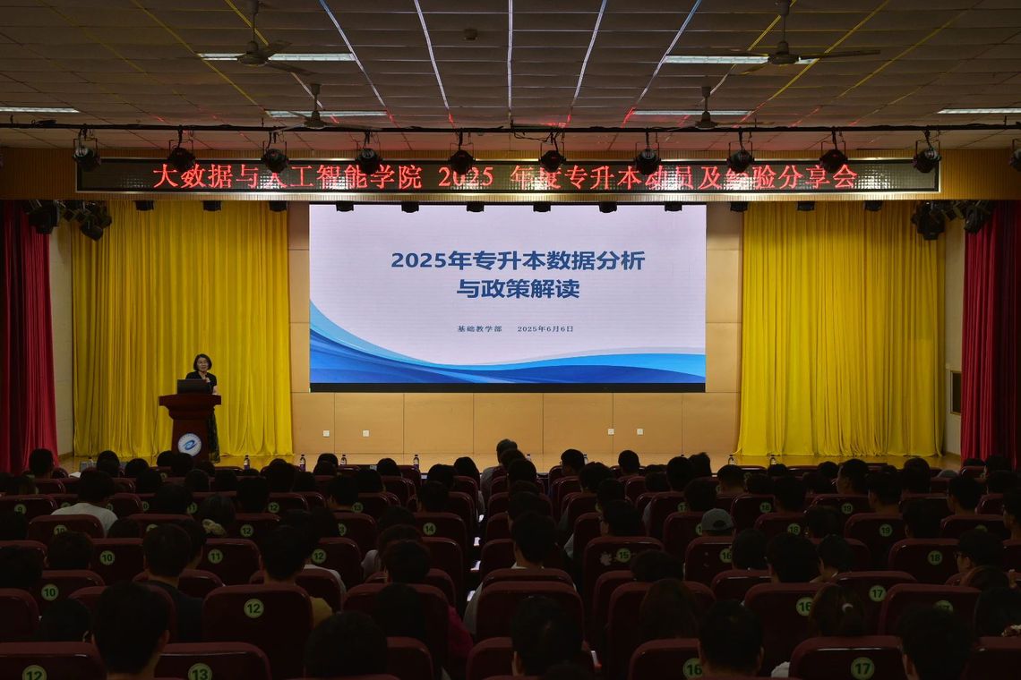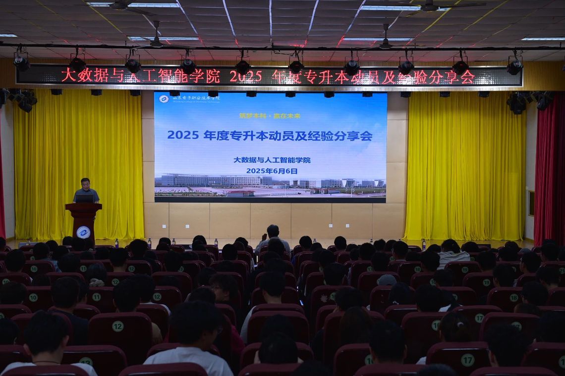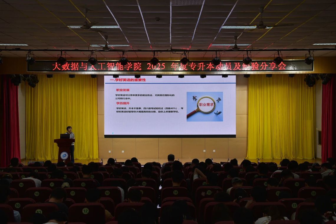 为规范专升本工作,帮助学生做好实习准备、明确学习目标、了解专业要求、精准备考并激发斗志,大数据与人工智能学院于6月6日下午在学术报告厅举办了2025年专升本动员及经验分享会。基础教学部主任任文娟、教师杜希春,学院院长刘学、教学科长李燕、优秀毕业生及学生代表参会,团总支书记李海彬主持。
