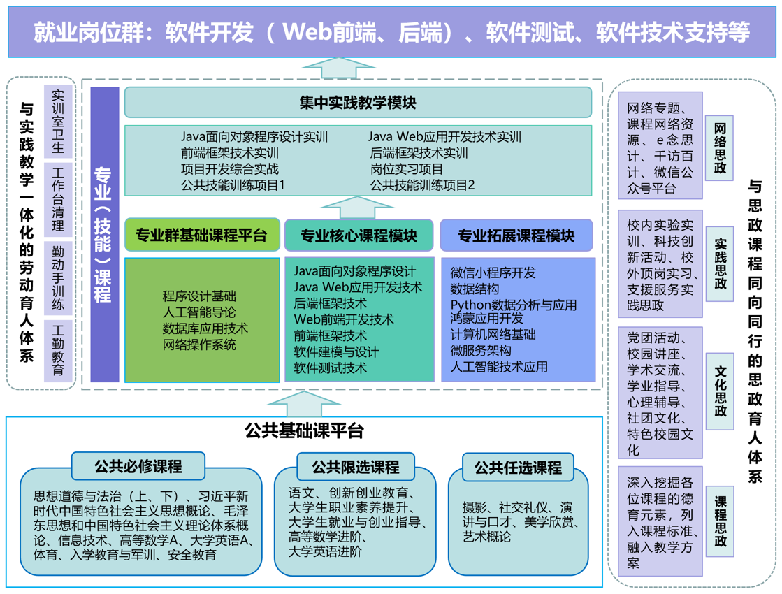 本专业坚持立德树人、德技并修,培养能够践行社会主义核心价值观,传承技能文明,德智体美劳全面发展,具有一定的科学文化水平,良好的人文素养、科学素养、数字素养、职业道德、创新意识,爱岗敬业的职业精神和精益求精的工匠精神,较强的就业创业能力和可持续发展的能力,掌握本专业知识和技术技能,具备职业综合素质和行动能力,面向软件和信息技术服务行业的计算机程序设计员、软件测试员、软件工程技术人员、信息系统运行维护工程技术人员等职业,能够从事软件开发、软件测试、软件技术支持、信息系统运维等工作的高技能人才。