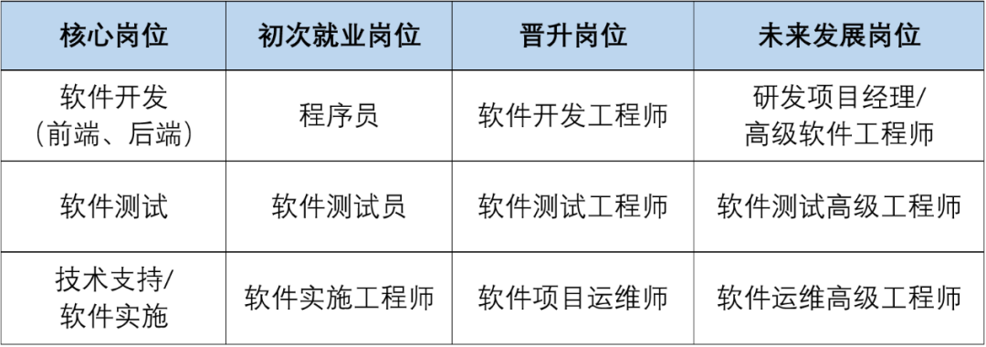 软件技术专业毕业生具有就业面宽、工作适应性强的特点,其就业岗位主要面向软件开发企业、政府部门,以及电信、财税、金融、证券、移动通讯等行业的企事业单位,从事软件开发(Web前端开发、后端开发)、软件测试、软件技术支持与服务、数据库管理与维护、办公自动化、计算机系统管理维护、软件产品营销等方面的技术与管理工作。