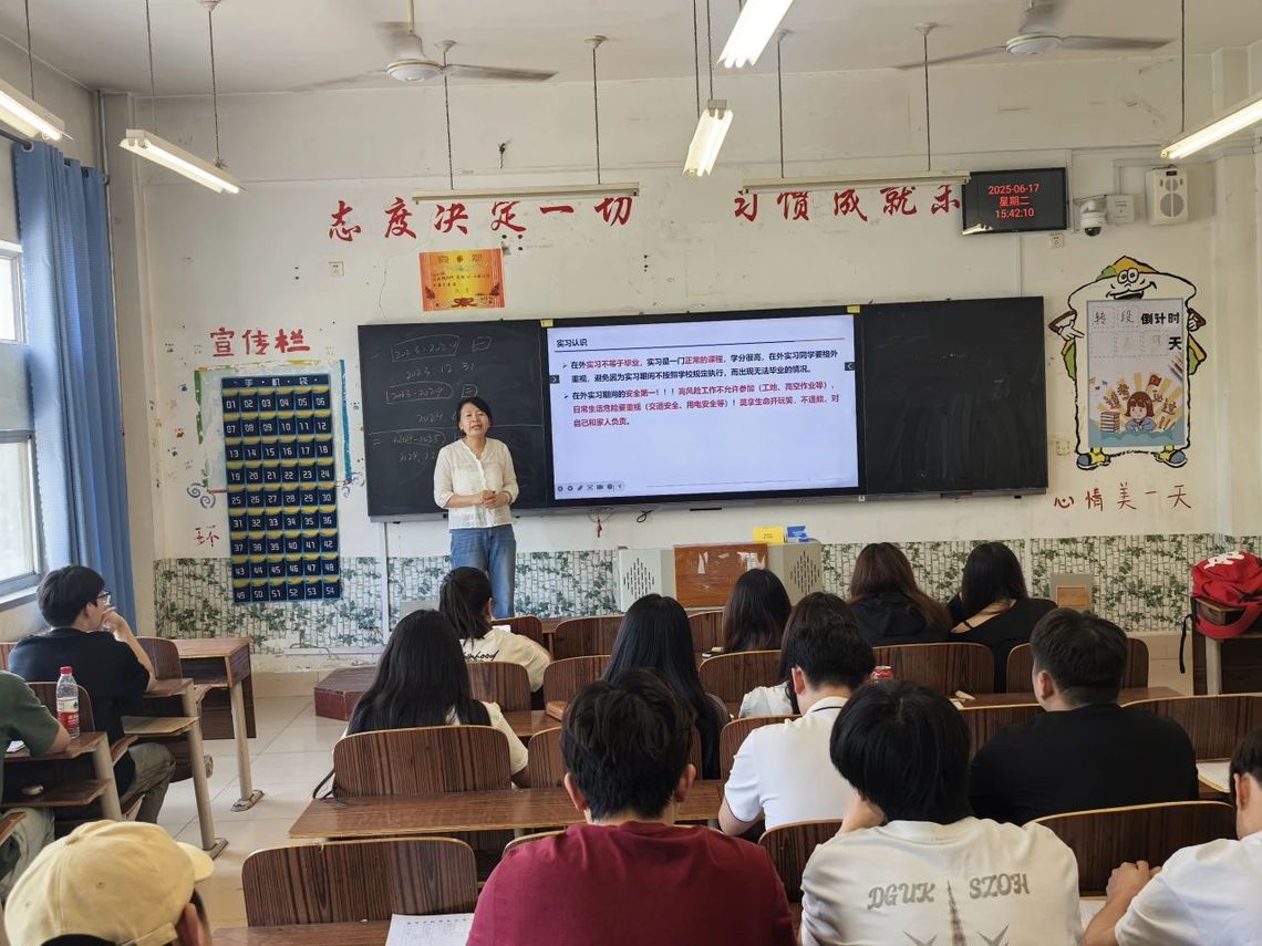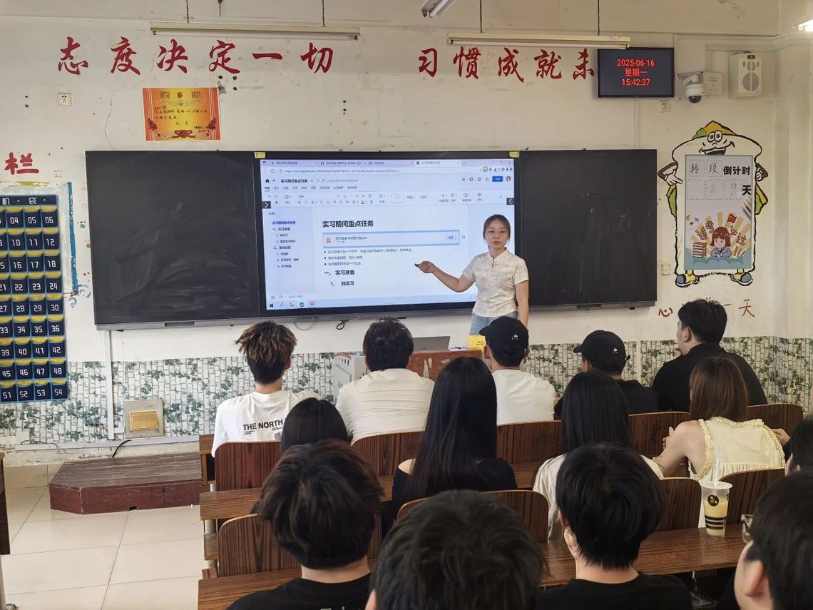 会上,实习指导老师们依托丰富的行业实践经验,从职业发展规划与行业前沿视角,深度剖析实习在高等教育中的核心价值。他们指出,实习是连接理论与实践的关键纽带,学生既能借此洞察行业动态、提升专业技能,又能强化责任担当,为职业发展奠定坚实基础。同时,实习指导老师与辅导员着眼学生长远发展,鼓励学生参与专升本深造,强调学历提升对能力进阶的重要性,提醒学生提前规划,适应 “实习生” 与 “备考者” 双重身份。此外,老师们通过案例分析,着重强调实习安全规范,引导学生树立安全意识,确保实习平稳有序开展。