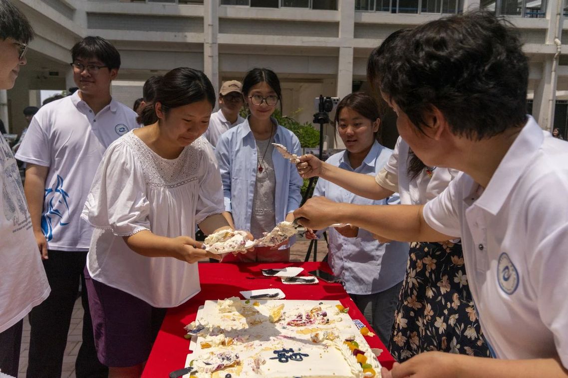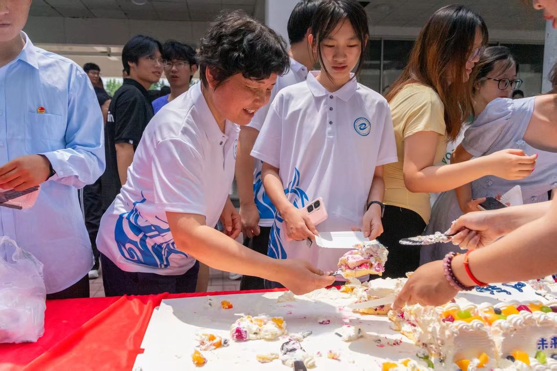 冷餐区,奶油蛋糕、各式零食与当季鲜果象征着校园生活的丰富多彩,当师生携手切开蛋糕时,热烈的掌声与欢呼声交织成一首青春的赞歌,久久回荡在心间。