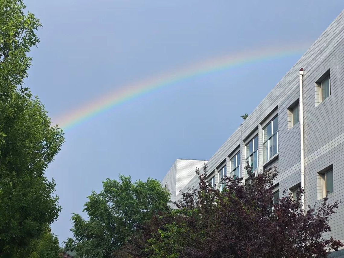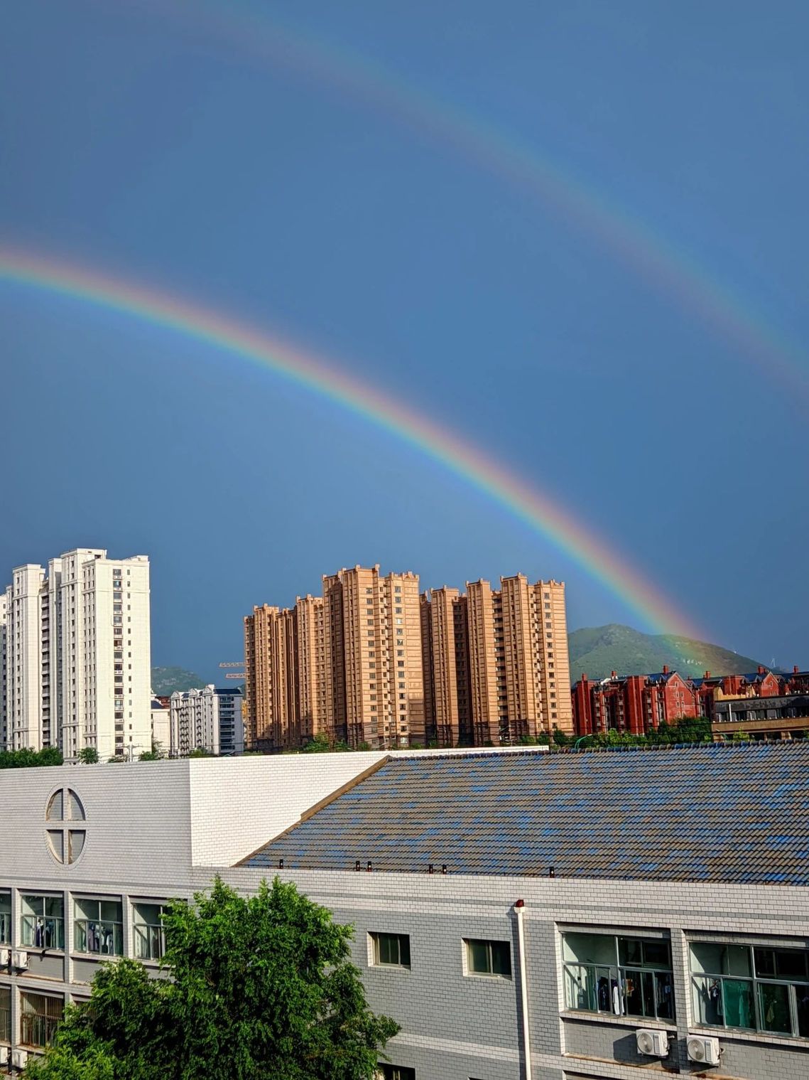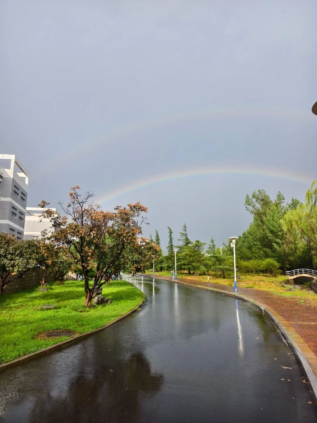 随着最后一门考试结束,雨幕悄然退场。金红色的夕阳刺破云层,为湿漉漉的校园镀上金边。就在此时东方天空赫然出现两道彩虹!主虹鲜艳夺目,副虹若隐若现,两道绚丽的彩虹横跨天际,色彩斑斓,如梦如幻,七彩光带将整个校园包裹在梦幻光晕里,将校园装点得格外美丽。