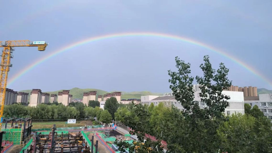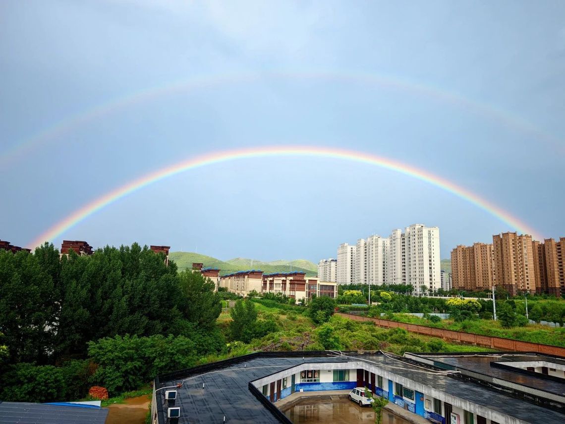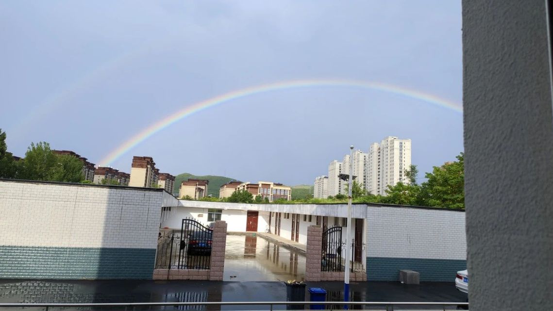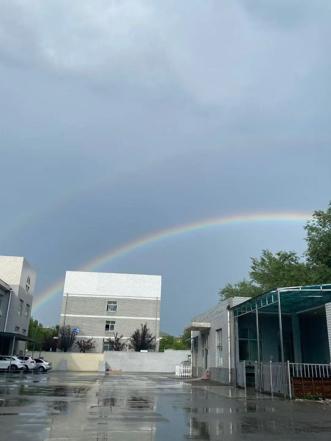 随着最后一门考试结束,雨幕悄然退场。金红色的夕阳刺破云层,为湿漉漉的校园镀上金边。就在此时东方天空赫然出现两道彩虹!主虹鲜艳夺目,副虹若隐若现,两道绚丽的彩虹横跨天际,色彩斑斓,如梦如幻,七彩光带将整个校园包裹在梦幻光晕里,将校园装点得格外美丽。