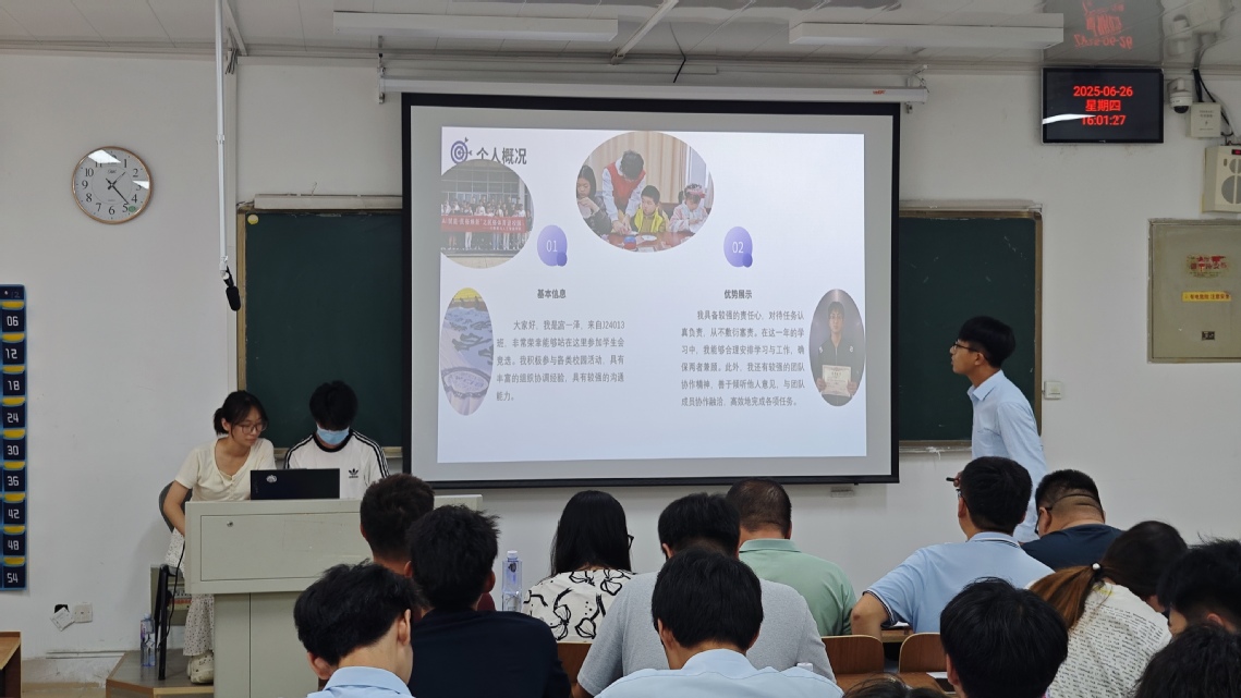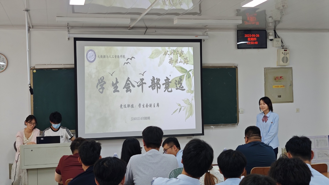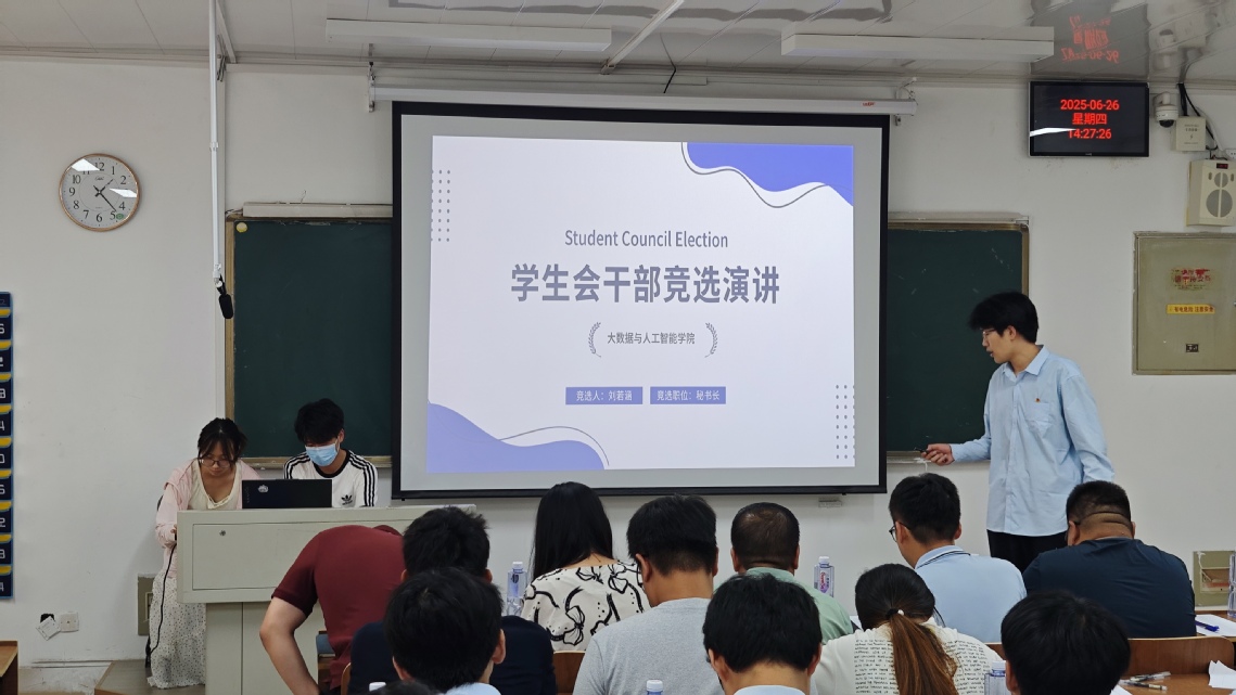 青春接力,使命传承。为保障我院学生会工作的有序衔接,选拔出有能力、有担当的学生干部,6月26日,大数据与人工智能学院第二届团总支学生会换届竞选答辩会在2217教室举行。我院团总支书记李海彬、全体辅导员老师,以及第一届团总支学生会主席团、学生骨干常委共同担任评委,众多怀揣热情的同学参与竞选,共同为学院学生工作注入新活力。