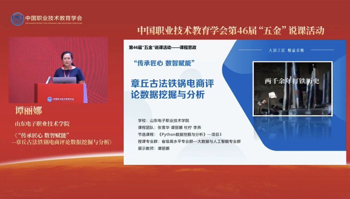 7月24日至25日,中国职业技术教育学会第46届“五金”说课活动在河南郑州举行。此次活动在线上线下累计吸引11万人次观摩。我校计算机与软件工程系《Python数据分析与应用》课程作品从全国890余个作品中脱颖而出,入选现场展示优秀案例。谭丽娜老师代表团队进行现场说课,获专家高度评价。
