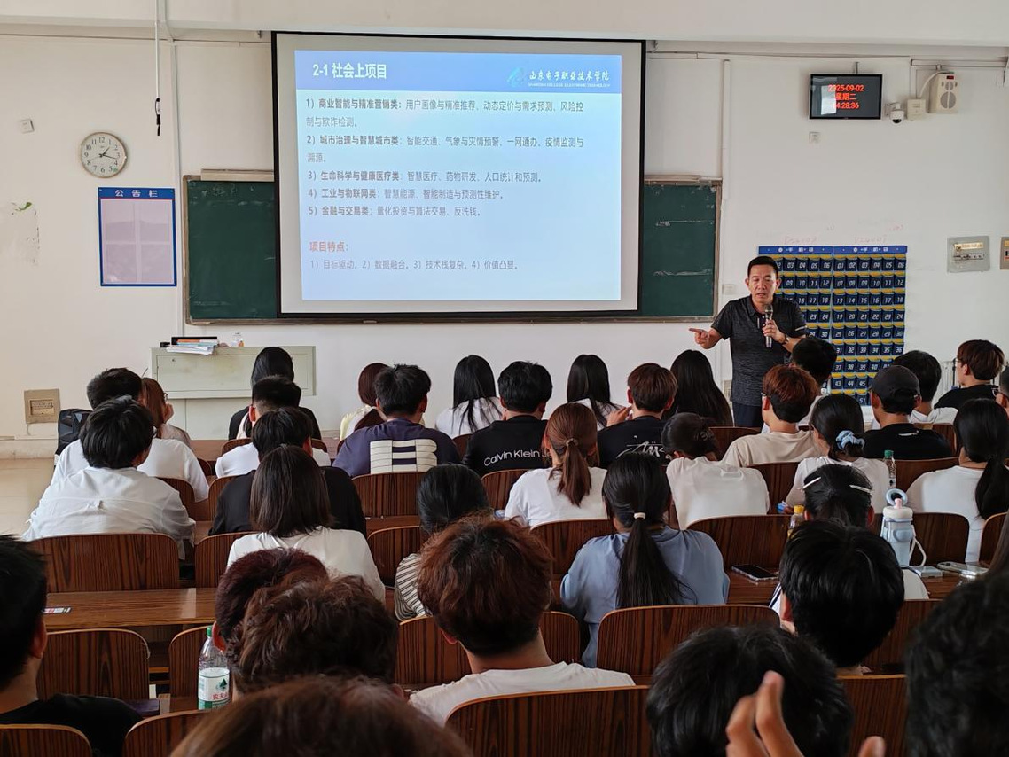 学校人工智能研究院负责人、济南市创客导师孙云涛老师以“专业、产业、就业”为核心为同学们带来了一场精彩讲座。他向同学们介绍了大数据的概念、技术发展现状、大数据的应用场景以及未来发展趋势,分享了大数据技术在各行各业中的应用案例和职业发展路径。他通过实际项目经验,向新生们展示了大数据技术解决实际问题的强大能力,并提供了宝贵的学习建议和职业规划指导。