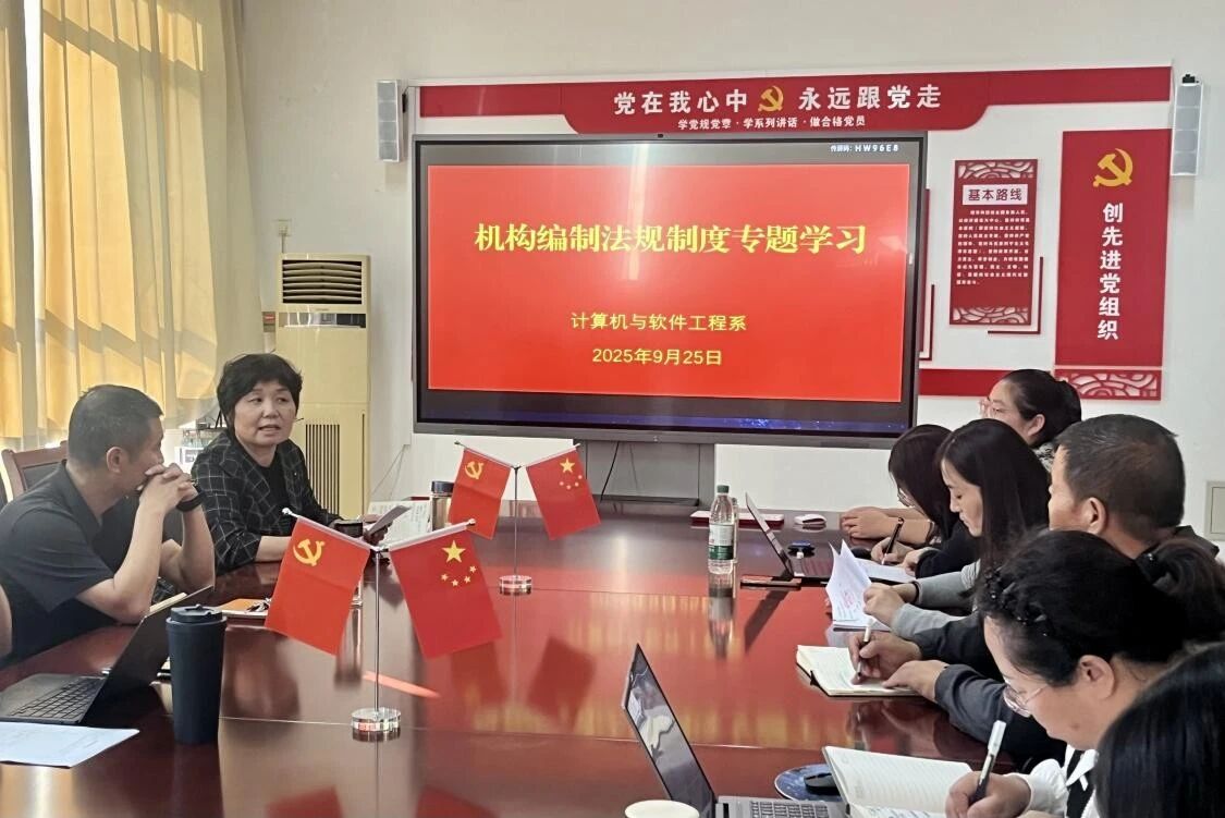 为深入贯彻落实学校《关于开展机构编制法规制度专题学习的通知》要求,切实提升党员队伍法治化、规范化管理水平,近日,计算机与软件工程系党总支组织开展“机构编制法规制度”专题学习活动。本次学习以“强化法规意识,提升管理效能”为目标,旨在让党员们深入理解机构编制法规,为后续工作提供坚实的理论支撑与规范指引。