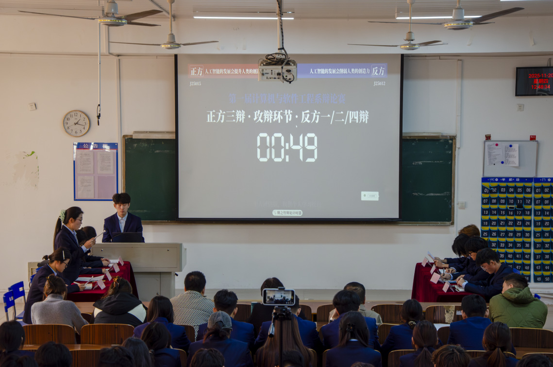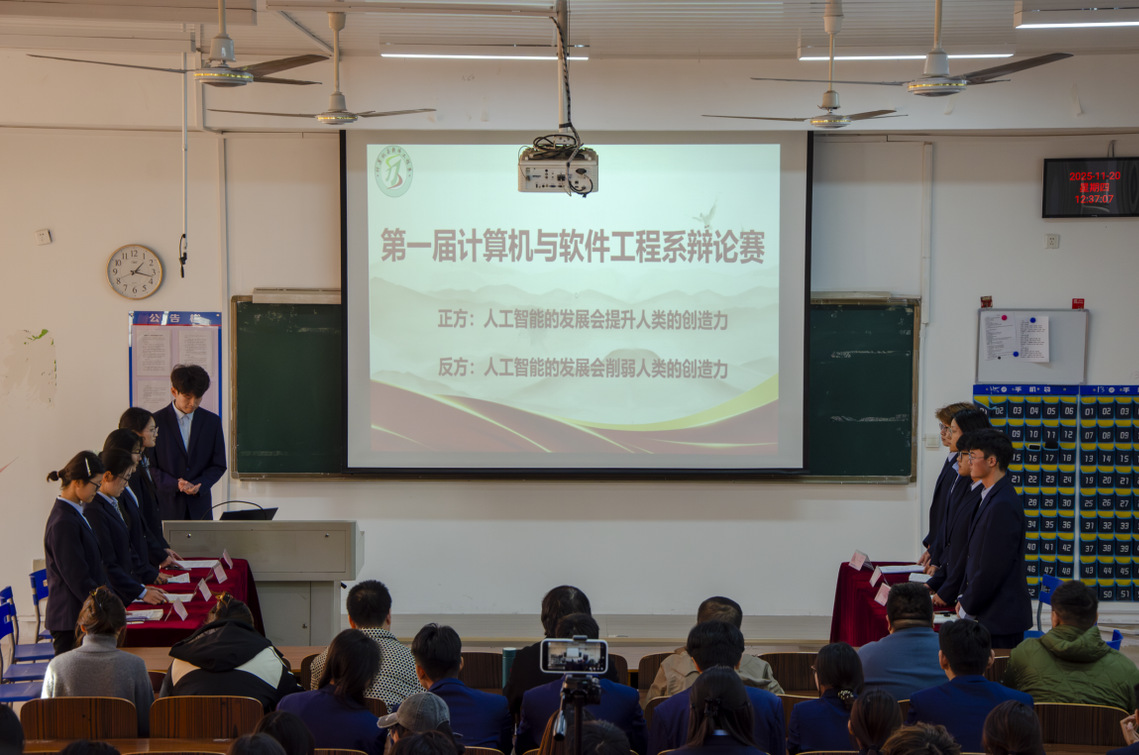 当AI技术重塑生活,人类创造力将迎来新生还是挑战?11月20日,计算机与软件工程系首届辩论赛决赛在阶梯一教室激烈收官。这场紧扣科技前沿的思辨对决,不仅为校园注入了理性探索的活力,更让“AI与人类创造力的关系”这一时代命题,成为师生热议的焦点。