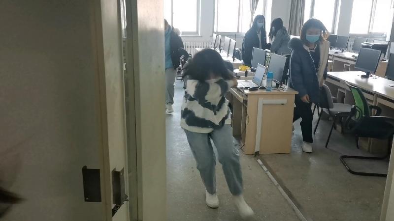 安全撤离后,在教学楼前广场集合,班主任、任课教师协助清点人数,每个教学楼实训室应到几人,实到几人,全部安全撤离,无伤亡人员。”演练结束。