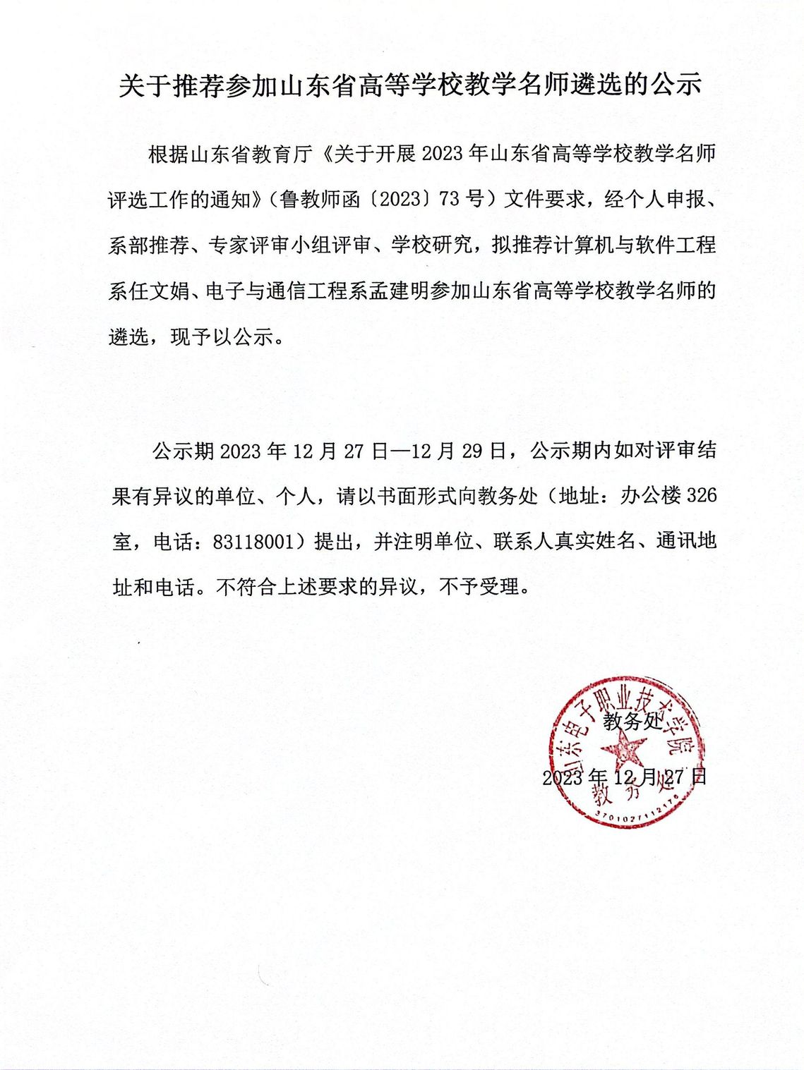 关于推荐参加山东省高等学校教学名师遴选的公示