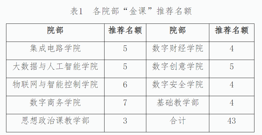 各二级院部根据所在部门的评选方案对申报教师的申报资格、申报材料进行审核、评选。按照学校推荐名额要求(见表1),确定推荐名单,随其申报材料一并报送学校。