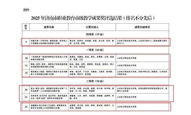 近日,济南市教育局发布了2025年职业教育市级教学成果奖评选结果,我校7项成果榜上有名。作为第一完成单位获教学成果奖特等奖1项、一等奖3项、二等奖3项,充分展现了学校教育教学改革成效和整体办学实力的显著提升。