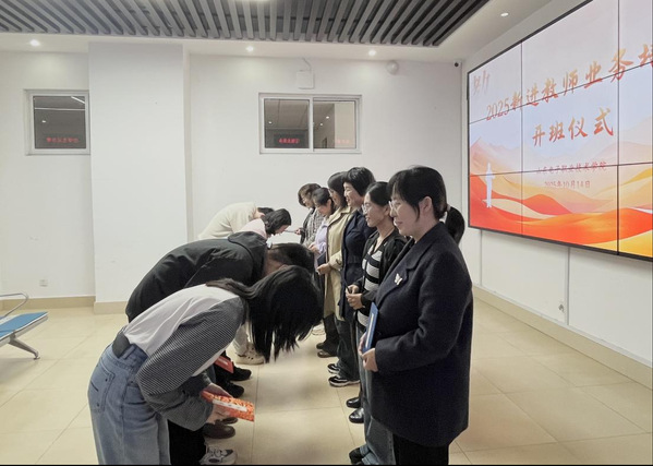 拜师环节中,16位新进教师走到指导教师面前,面向指导教师行鞠躬礼。随后,师徒双方互赠拜帖,正式确立师徒关系,传承教育使命。