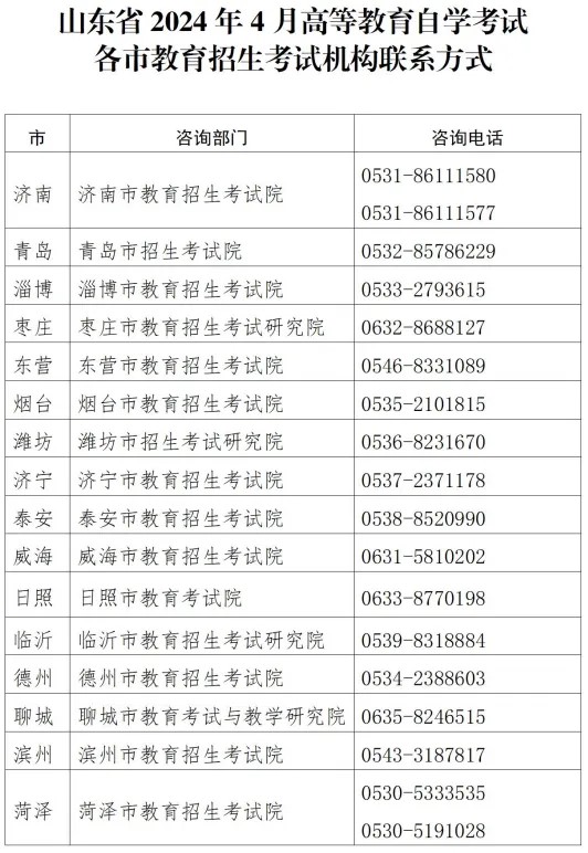 附件:山东省2024年4月高等教育自学考试各市教育招生考试机构联系方式.doc