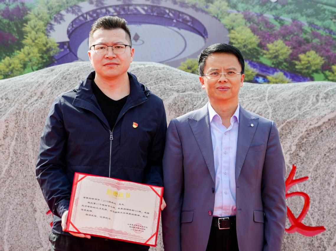徐明宇为感谢学校培养,特别向学校捐赠优质桃树苗100棵。李卫东代表学校感谢校友向母校捐赠的树苗并颁发捐赠证书。他表示,此次活动是学校、校友、企业协同育人的创新实践,承载着校企共促人才成长的深切期望,校友的捐赠既是对母校的感恩回馈,也表达了拳拳热忱,希望企业和校友能继续关心、关注学校的发展,学校也将继续努力为更多的企业、校友搭建交流与合作的平台。