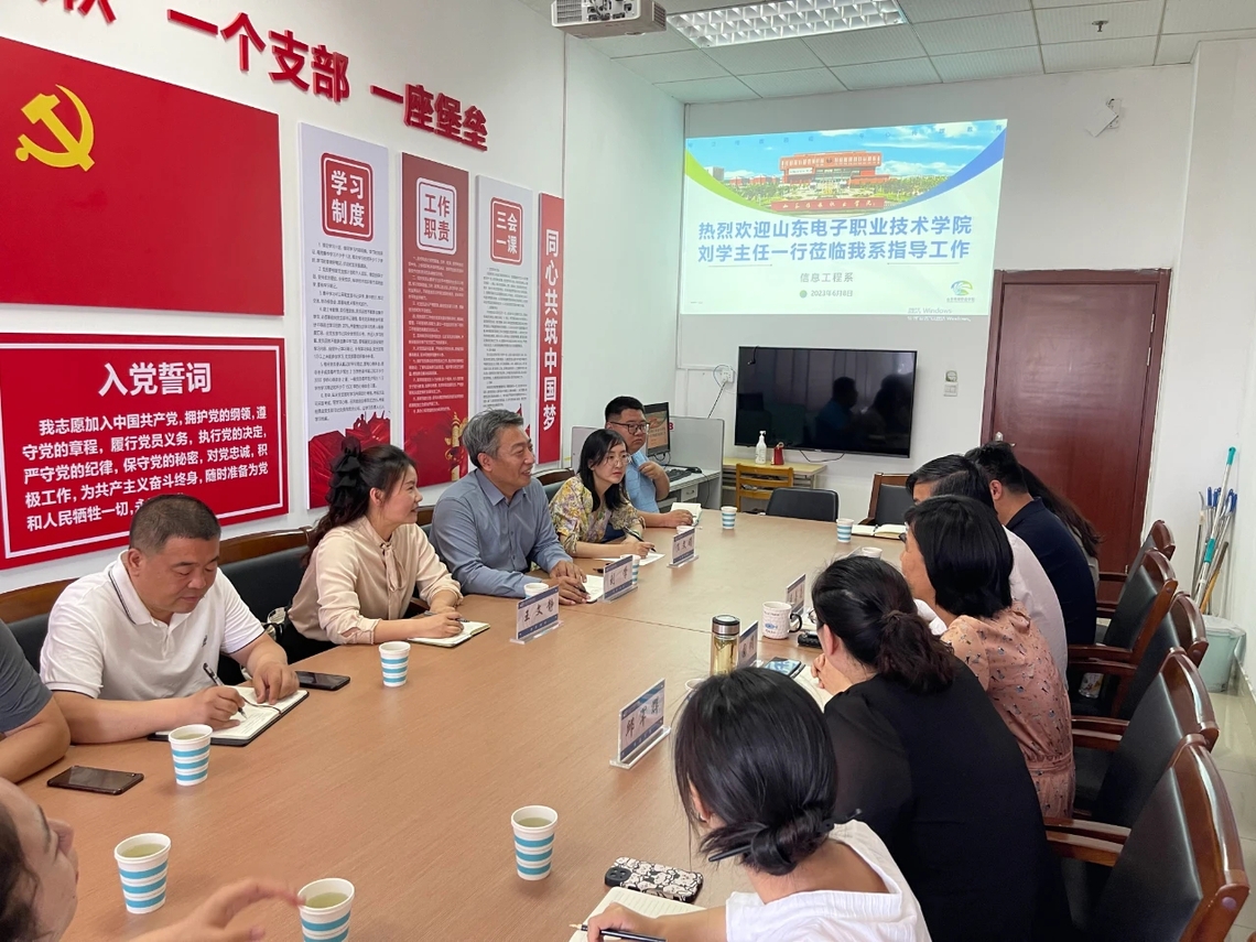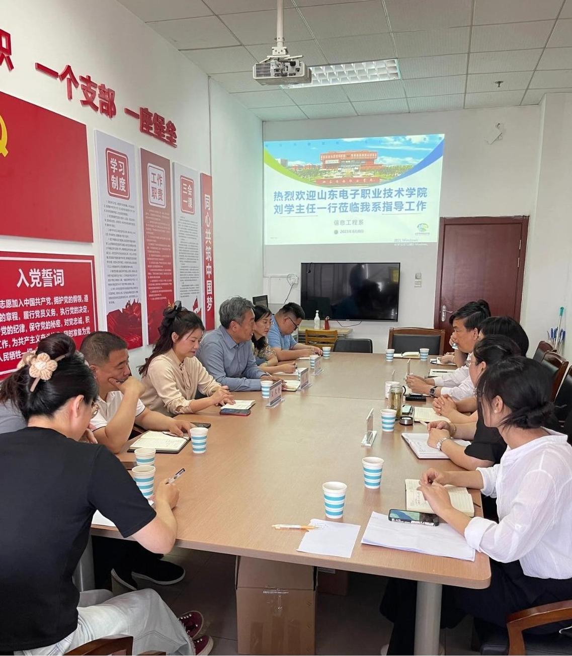 为深入推进学习贯彻习近平新时代中国特色社会主义主题教育走深走实,拓展发展思路,借鉴兄弟院校经验,促进互动交流,6月8日,计算机与软件工程系主任刘学带队,一行7人赴山东传媒职业学院信息工程系走访调研,系主任董善志等同仁热情接待了调研小组。双方就专业建设、学风涵养及孔子学堂建设作了深度学习和交流,同时实地参观了信息工程系党建阵地、标准化教室、孔子学堂。
