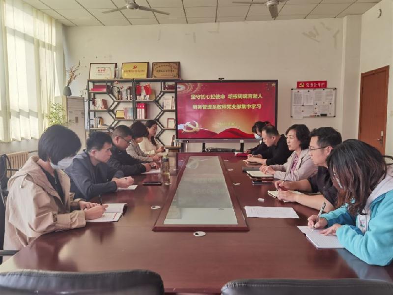 为深入学习贯彻党的二十大精神,10月20日下午商务管理系教师党支部开展以“坚守初心担使命,培根铸魂育新人”为主题的集中学习活动。活动由商务管理系教师党支部书记李敏主持。