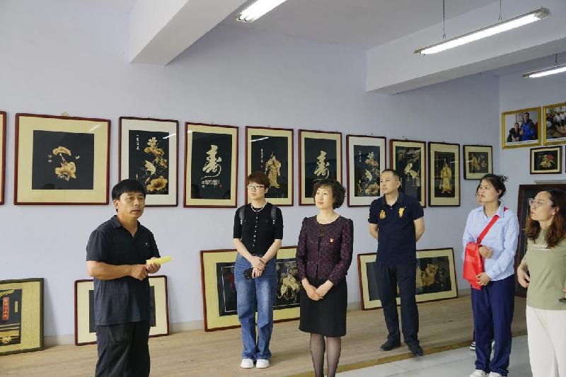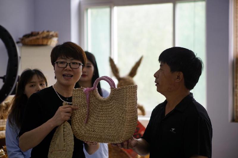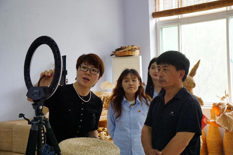 5月18日,商务管理系师生一行来到白云湖街道办事处,帮扶章丘蒲苇草编手工技艺非遗传承人刘永峰和他所在的社区村民,开展爱心助农非遗草编现场专场直播活动。