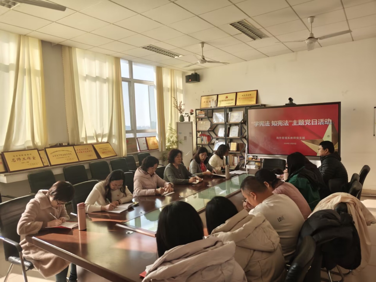 12月4日是第十一个国家宪法日。为深入学习宣传贯彻习近平法治思想,认真学习宣传贯彻习近平总书记关于宪法的重要讲话和重要指示批示精神,进一步在党员队伍中普及宪法知识、弘扬宪法精神,引导党员教师自觉成为宪法的忠实崇尚者、自觉遵守者、坚定捍卫者,商务管理系教师党支部组织开展“学宪法 知宪法”主题党日活动。