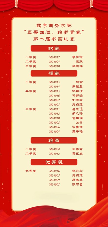 此次书画大赛不仅为同学们提供了一个展示自我、交流学习的平台,更激发了同学们对传统文化的热爱与传承意识。通过比赛,同学们不仅提升了自己的书画技艺,还加深了对中华优秀传统文化的理解与认同。未来,商务管理系将继续秉持“传承与创新并重”的理念,举办更多类似活动,为培养具有人文素养的商业精英贡献力量。