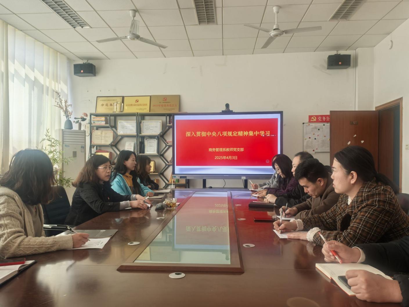 2025年4月3日,商务管理系教师党支部积极响应中央关于改进工作作风、密切联系群众的中央八项规定精神,精心组织开展了深入贯彻中央八项规定精神学习教育。此次活动旨在进一步加深全体党员教师对中央八项规定精神的理解和认识,切实转变工作作风,提升服务质量,密切联系师生群众。