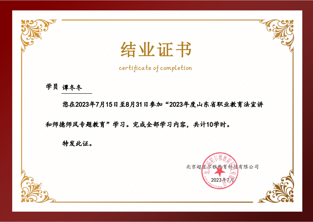 2023-07-15 至 2023-08-31日期间商务管理系教师谭冬冬参加了2023年度山东省职业教育法宣讲和师德师风专题教育,本次培训依托超星平台采用线上方式进行,系统解读职业教育法修订过程、主要内容等,学习习近平新时代中国特色社会主义思想、习近平总书记关于教育的重要论述、“四史”教育、《新时代高校教师职业行为十项准则》等。通过此次培训学习,收获颇丰。