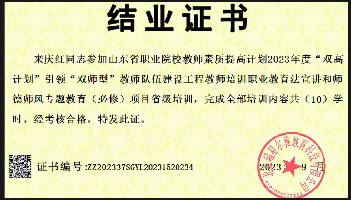 2023年7月16日至8月20日,商务管理系教师来庆红参加了2023年山东省职业院校(高职)“双高计划”引领“双师型”教师队伍建设工程教师培训职业教育法宣讲和师德师风专题教育(必修)项目省级培训,本次培训通过在线方式进行。