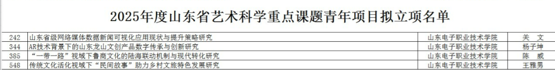 山东省艺术科学重点课题旨在推动艺术科学领域的理论创新与实践探索,重点支持具有前瞻性、战略性和现实意义的研究项目,竞争激烈。两项青年项目的成功立项,不仅是对王雅男博士、陈威两位青年学者研究能力与选题价值的高度认可,也充分体现了商务管理系在跨学科研究、服务地方文化经济发展方面的前瞻布局和扎实积累。