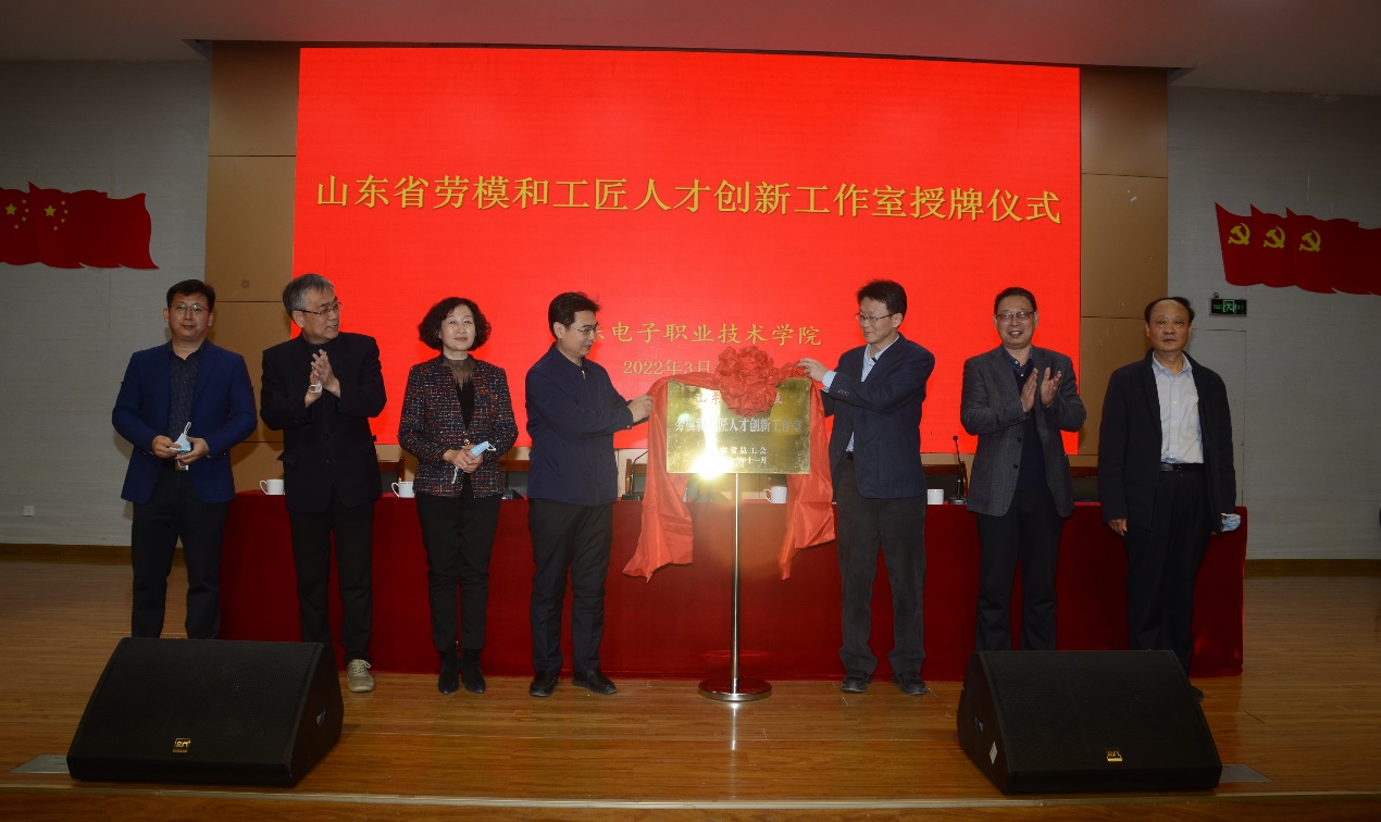 2022年3月15日,山东电子职业技术学院隆重举行“山东省劳模和工匠人才创新工作室”授牌仪式。省委省直机关工委副书记王树山同志,群众工作部(统战部)副部长秦峰同志,省工业和信息化厅党组成员、副厅长王晓同志,原机关服务中心主任郭宝顺同志及学校领导班子成员出席此次活动。学校党委副书记、院长张训华主持授牌仪式。
