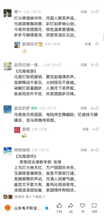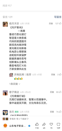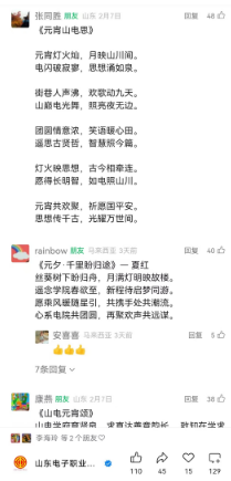 作为活动承办方,商务管理系分工会巧借新媒体传播优势,依托学校工会微信公众号搭建云端诗社,创新设置了“即兴创作+互动点赞”的数字化参与模式。教职工们热情高涨,或即兴挥毫创作原创诗词,或化身当代推敲客字斟句酌,将家国情怀、教育理想、佳节愿景融入平仄韵律。据统计,活动期间累计收到诗词作品120余首,留言区互动量达上千人次,精选作品单篇最高获赞达127次。这场别开生面的“云端诗会”实现三重文化效应:一是以“赛”促创,激发了教职工对诗词的热爱和创作热情;二是以“云’为媒,构建了传统文化传承新场景;三是以“情”聚力,通过共赏诗韵增强集体认同。正如参赛教师所言:在平仄对仗中触摸文化基因,于互动点赞间感受同事情谊,这个元宵节过得格外风雅。
