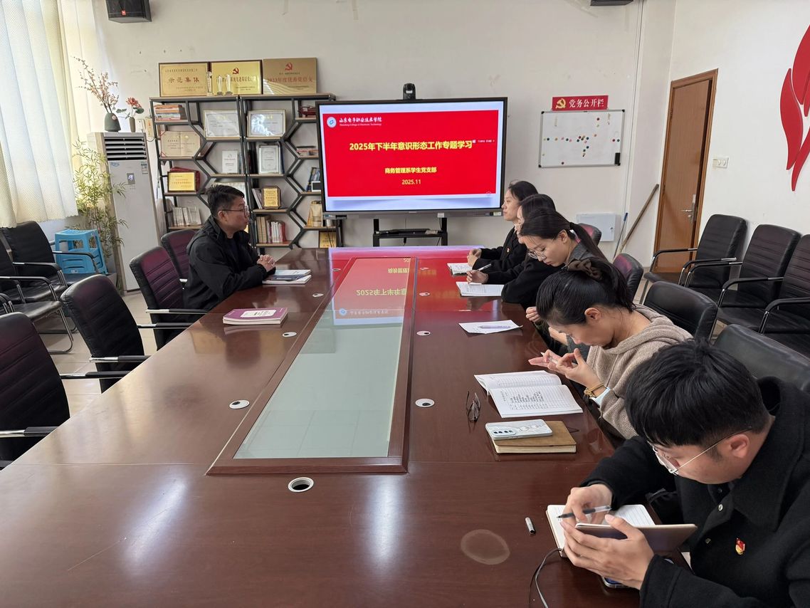 为深入学习贯彻习近平总书记关于意识形态工作的重要论述,全面落实上级党组织关于意识形态工作的决策部署,分析研判当前形势,安排下一阶段重点任务,11月3日,商务管理系学生党支部在综合楼408会议室组织召开2025年下半年意识形态工作专题会议。