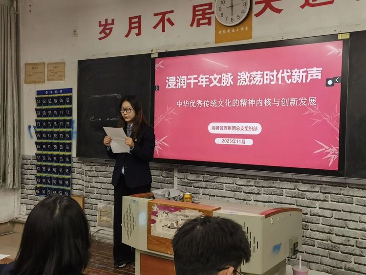 为深入学习中华优秀传统文化的精神内核,推动传统文化在青年群体中传承创新,11月20日,商务管理系团总支在3203教室开展书记读书会——中华优秀传统文化的深厚内涵及繁荣发展,本次读书会旨在思想碰撞中感受中华优秀传统文化的魅力,在交流探讨中凝聚传承共识。2025级全体团支书参加了本次活动 。