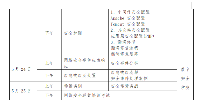 通过6天的集中实战培训,采用“线上+线下”模式,针对网络安全运维的知识点要求,做相关技能要求重点培训,参培后具备网络协议安全、Web安全防护、等级保护、安全设备运维、网络攻防原理、代码审计能力等教学能力。