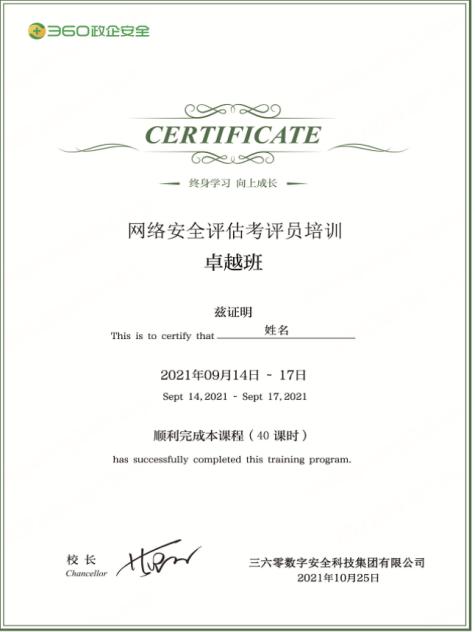 学员在培训学习期间,应遵守学习的各项规章制度,积极参加实操训练,全程参加本次培训及考核学员,可获得三六零数字安全科技集团有限公司颁发学时证明,如图参考。