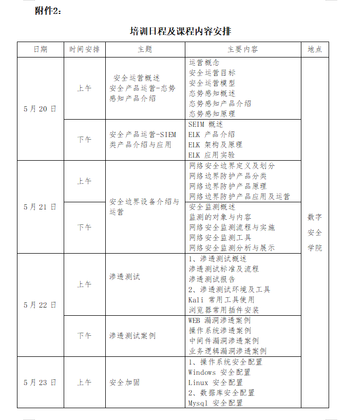 为贯彻《国家职业教育改革实施方案》《现代产业学院建设指南(试行)》《关于深化现代职业教育体系建设改革的意见》等国家有关文件要求,全面落实职业院校实施学历教育与培训并举的法定职责,按照育训结合、长短结合、内外结合的要求,促进职业院校加强专业建设、深化课程改革、增强实训内容、提高师资水平,全面提升教育教学质量。济南市信创市域产教联合体为指导单位,山东电子职业技术学院为承办单位,360数字安全集团为技术支撑单位,拟定于5月20日-5月25日举办“网络安全运维”实战班公益师资培训,现通知如下: