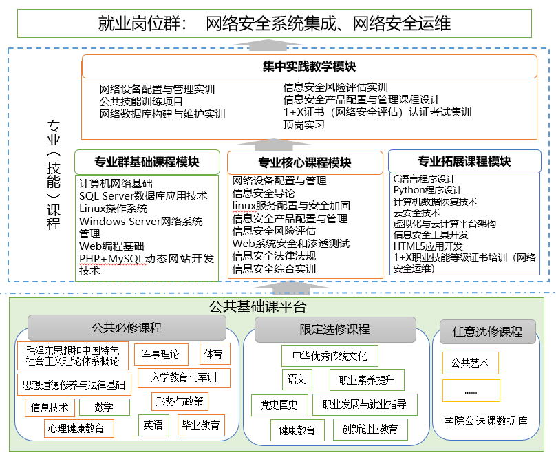 我院作为深信服1+X证书试点单位,将信息安全技术应用专业的课程体系和职业技能等级证书、全国职业院校技能大赛的内容相融合,实现了课证融合、课赛融通。主要开设课程有:网络设备配置与管理、Linux服务器配置及安全加固、信息安全产品配置与管理、Web系统安全和渗透测试、信息安全风险评估、网络数据库构建与维护、信息安全法律法规等。