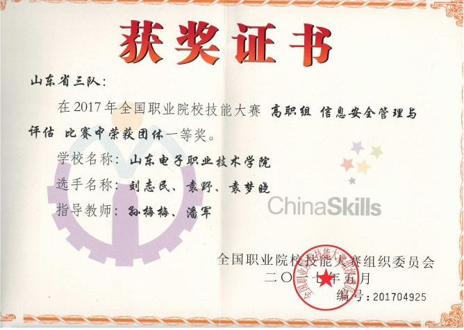 将国家职业技能大赛“计算机网络应用”、“信息安全管理与评估”赛项内容提炼转化为相关课程案例项目,技能大赛成绩显著。在全国/山东省职业技能竞赛中获得国赛一等奖1项、二等奖1项、三等奖2项,省赛一等奖8项、二等奖6项;在其他各级各类行业企业比赛中获得优异成绩,通过参加竞赛,有多名同学获得国内信息安全知名企业就业offer。