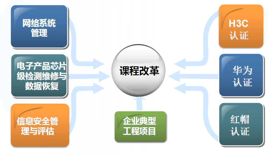 以国家/山东省职业院校技能大赛“网络系统管理”、“信息安全管理与评估”、“电子产品芯片级检测维修与数据恢复”赛项案例为引领,融入专业核心课程,实现课赛融通;与1+x职业技能等级证书、华为/华三、红帽等职业证书相融合,实现课证融通;将企业典型网络工程项目引入课堂,实现专业学习与就业岗位“零距离”对接。