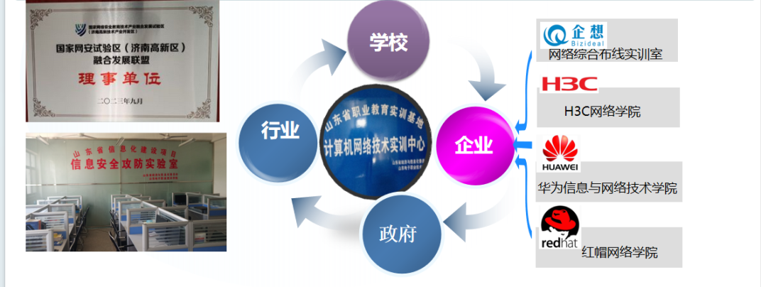 本专业深度探索“政-校-行-企”产教融合,建有山东省职业教育实训基地-计算机网络技术实训中心、山东省电子政务平台-信息安全攻防实验室、国家网安试验区(济南高新区)融合发展联盟。与华为、新华三、红帽(中国)、思科(中国)等国内知名企业合作先后建立“华为信息与网络技术学院”、“H3C网络学院”等。