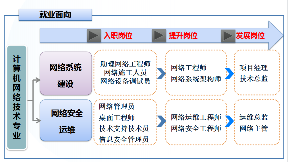 提升岗位有:网络工程师、网络系统架构师、网络安全工程师等;