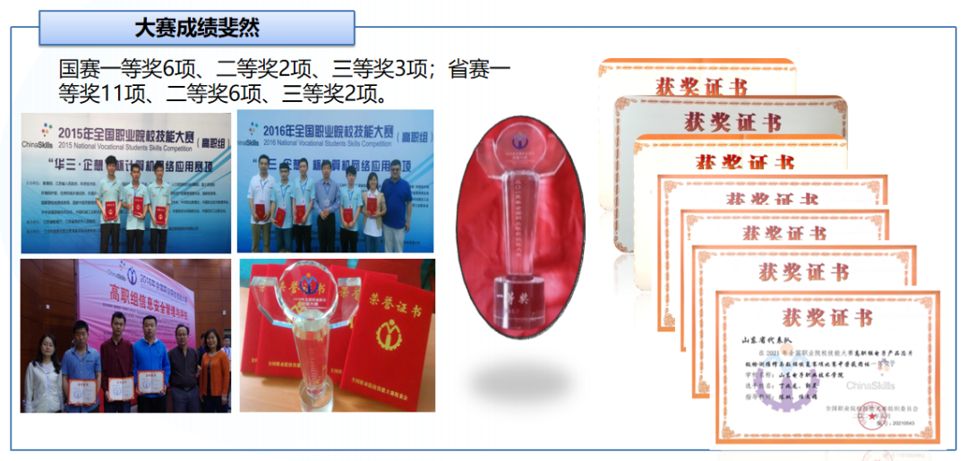 该专业学生在全国/山东省职业院校技能大赛中荣获国赛一等奖6项、二等奖2项、三等奖3项,省赛一等奖12项、二等奖7项、三等奖2项。
