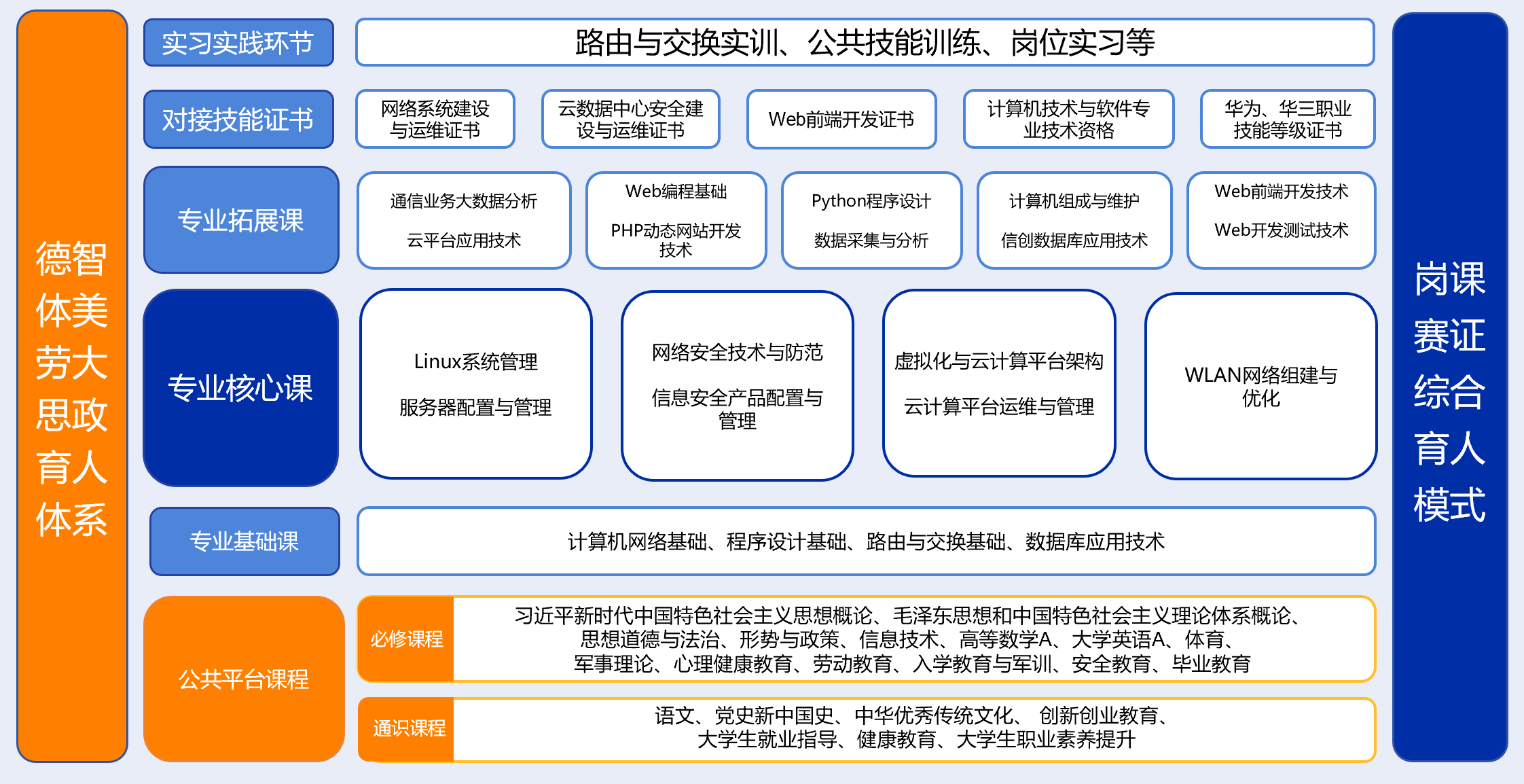 计算机网络技术专业以落实立德树人为根本任务,以培养德智体美劳全面发展的社会主义建设者和接班人为教育使命,按照岗课赛证综合育人模式的要求,构建了计算机网络技术专业的课程体系,主要课程类型包括公共平台课程、专业基础课程、专业核心课程、专业拓展课程、对接技能证书课程和实习实践课程。