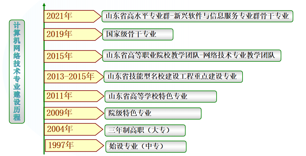 山东电子职业技术学院计算机网络技术专业始建于1997年,自2004年设置为三年制大专并开始招生,办学历史悠久、经验丰富、社会认可度高、师资力量雄厚。该专业为国家骨干专业、山东省特色专业、山东省技能型名校建设工程重点建设专业、山东省高水平专业群-新兴软件与信息技术服务专业群骨干专业,网络技术专业教学团队为山东省高等职业院校优秀教学团队。