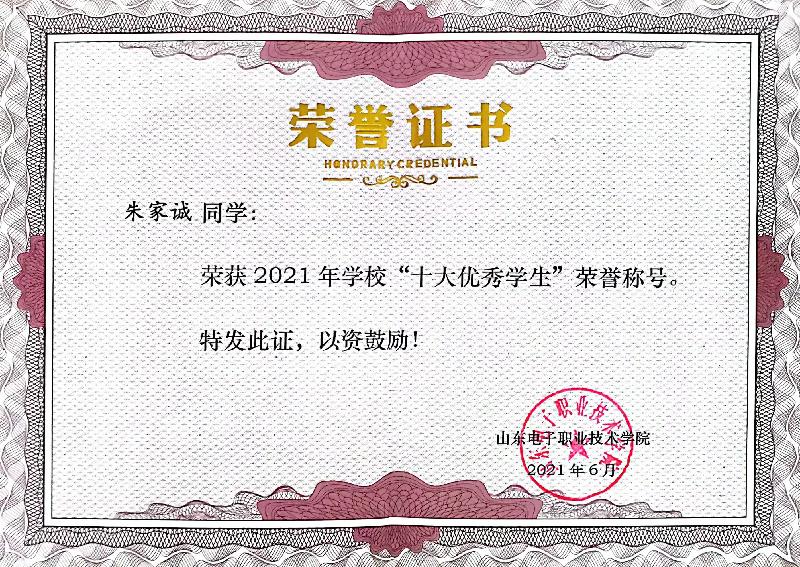 朱家诚,政治面貌中共党员,2014年入伍,2019年下士军衔退役复学,2019年至今就读于山东电子职业技术学院,曾担任山东电子职业技术学院团委委员,院国旗班团支书,电子与通信工程系团总支书记助理,D19005班班长,学习成绩优异,在校表现突出。