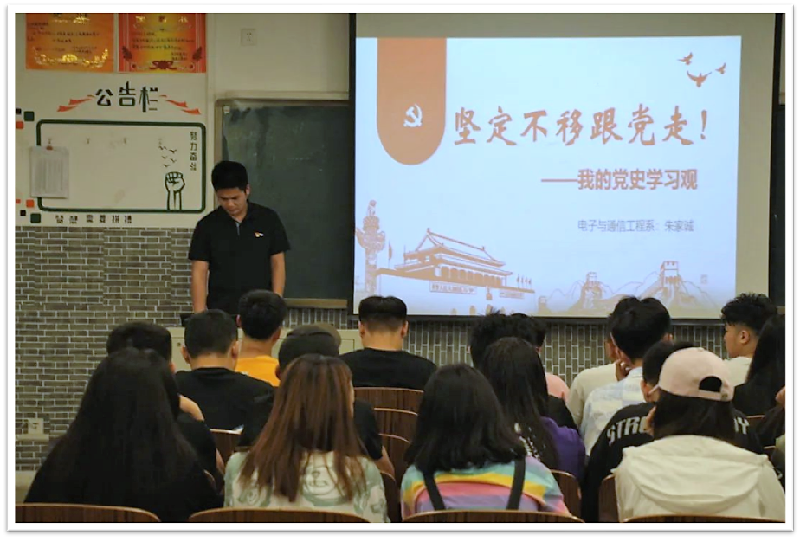 回到校园的他不忘党员身份,不忘军人本色,努力奋斗、积极进取、乐于奉献,学习成绩优异,在校表现突出。朱家诚于2019年6月28日经支部大会通过成为预备党员,2020年6月28日电子与通信工程系学生党支部党员大会全票通过转为正式党员。作为共产党员,他忠心向党,思想积极向上,认真学习党的先进理论,积极拥护党的路线、方针、政策,积极践行社会主义核心价值观,在学习强国APP上学习积分名列前茅,在学习、工作和生活中,时刻坚持用党员的各项标准严格要求自己,处处积极发挥党员的先锋模范作用。同时他深知一名党员不仅要做党的坚决拥护者,更要做党的理论宣讲者,他积极加入学院党史故事宣讲小组,电子与通信工程系“e”青春宣讲团,加强理论学习的同时,积极传播党的先进理论、光辉历程,党史宣讲3场,讲团课5场,推进党的先进思想在同学们心中学深学实。
